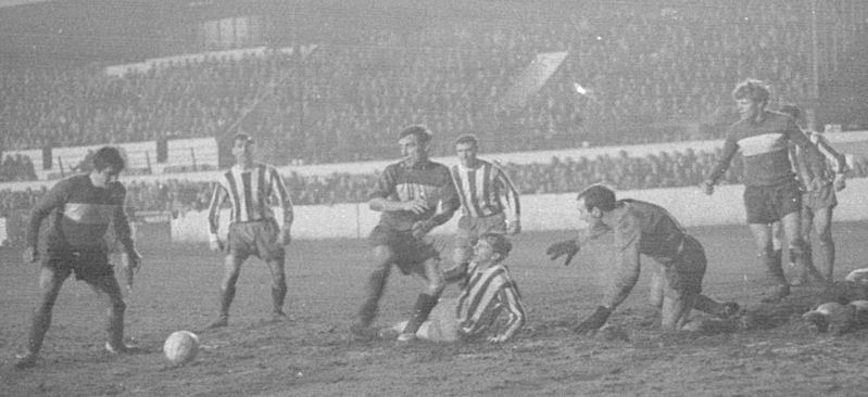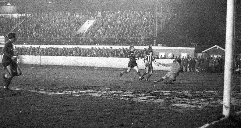 More goalmouth action with Don Campbell looking like he's about to clear.